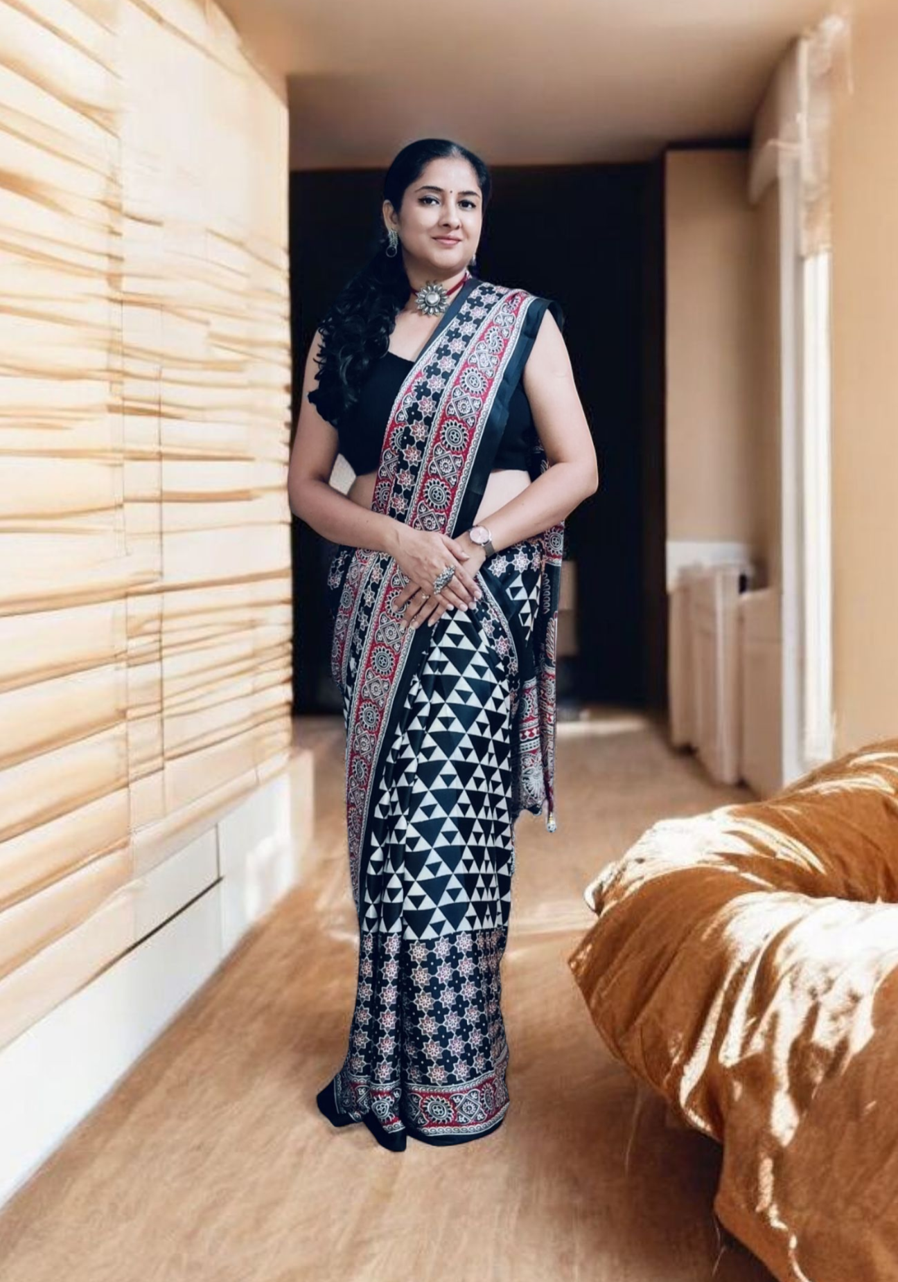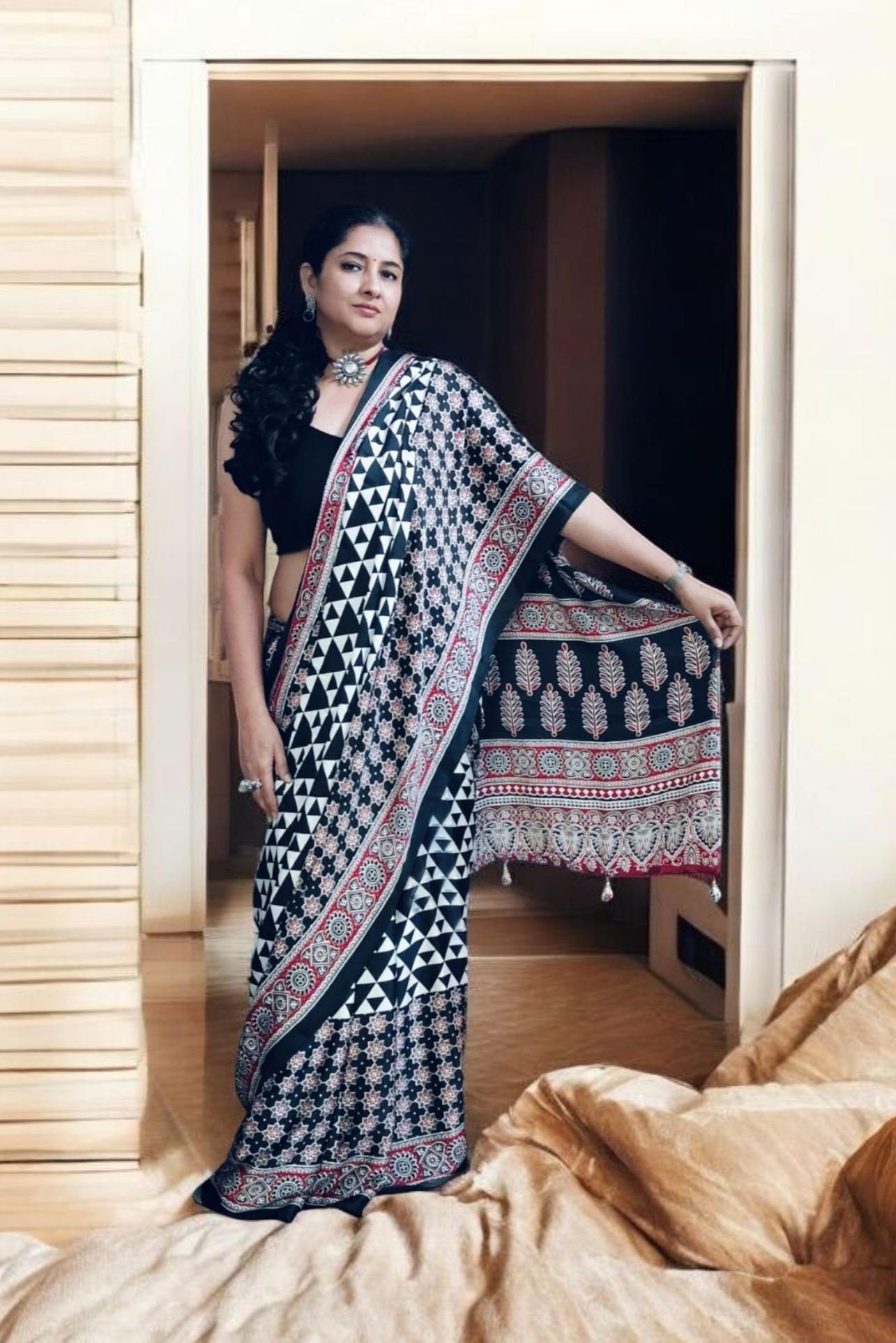Aarohi Handcrafted Black & White Geometric Saree with Ajrakh Pallu