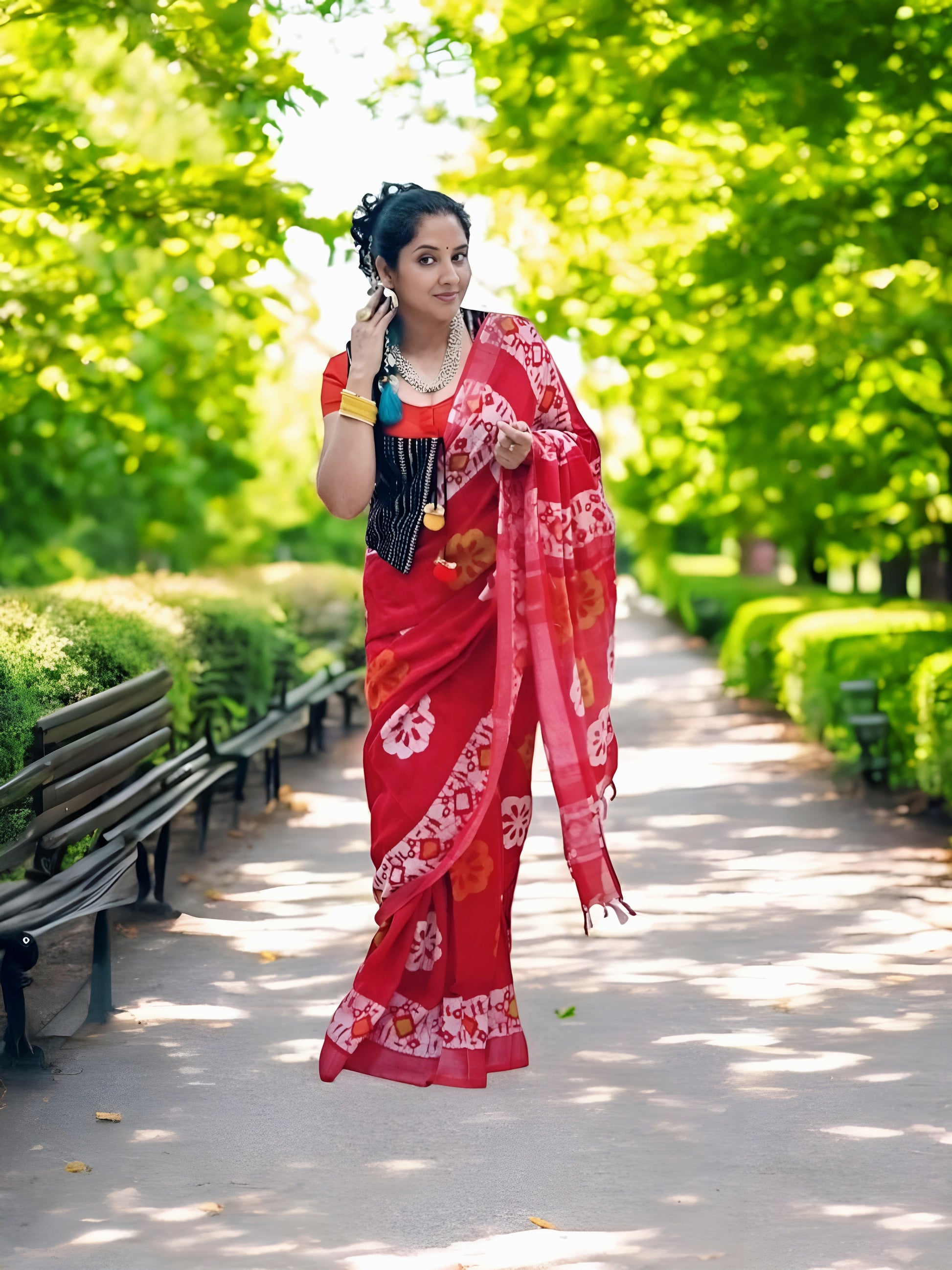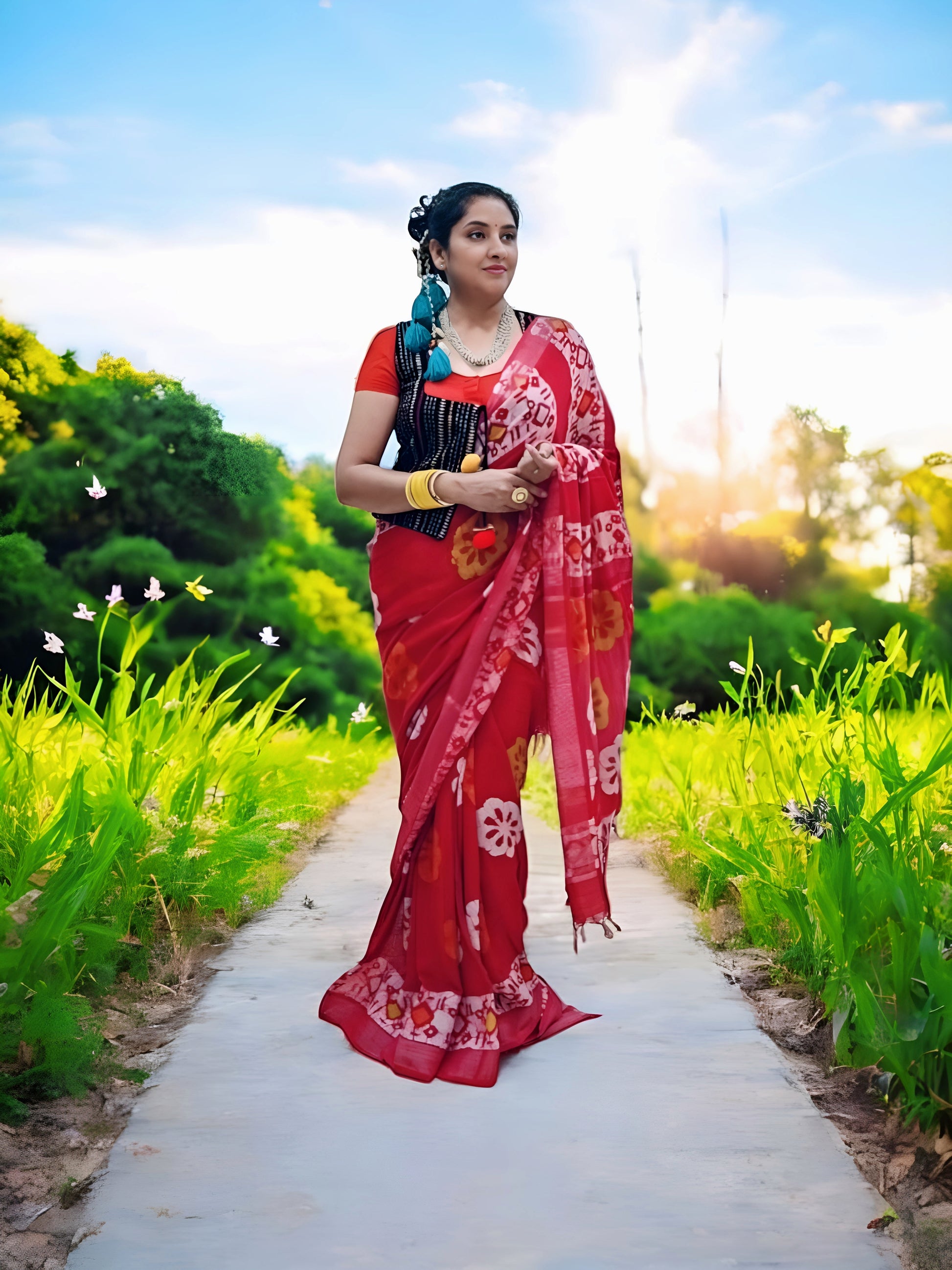 The deep red base is adorned with intricate hand block printing, showcasing fine Indian craftsmanship and adding a unique, artisanal touch to your wardrobe. Whether you're dressing up for a puja, cultural event, or a day at work, this saree offers effortless grace and style.
